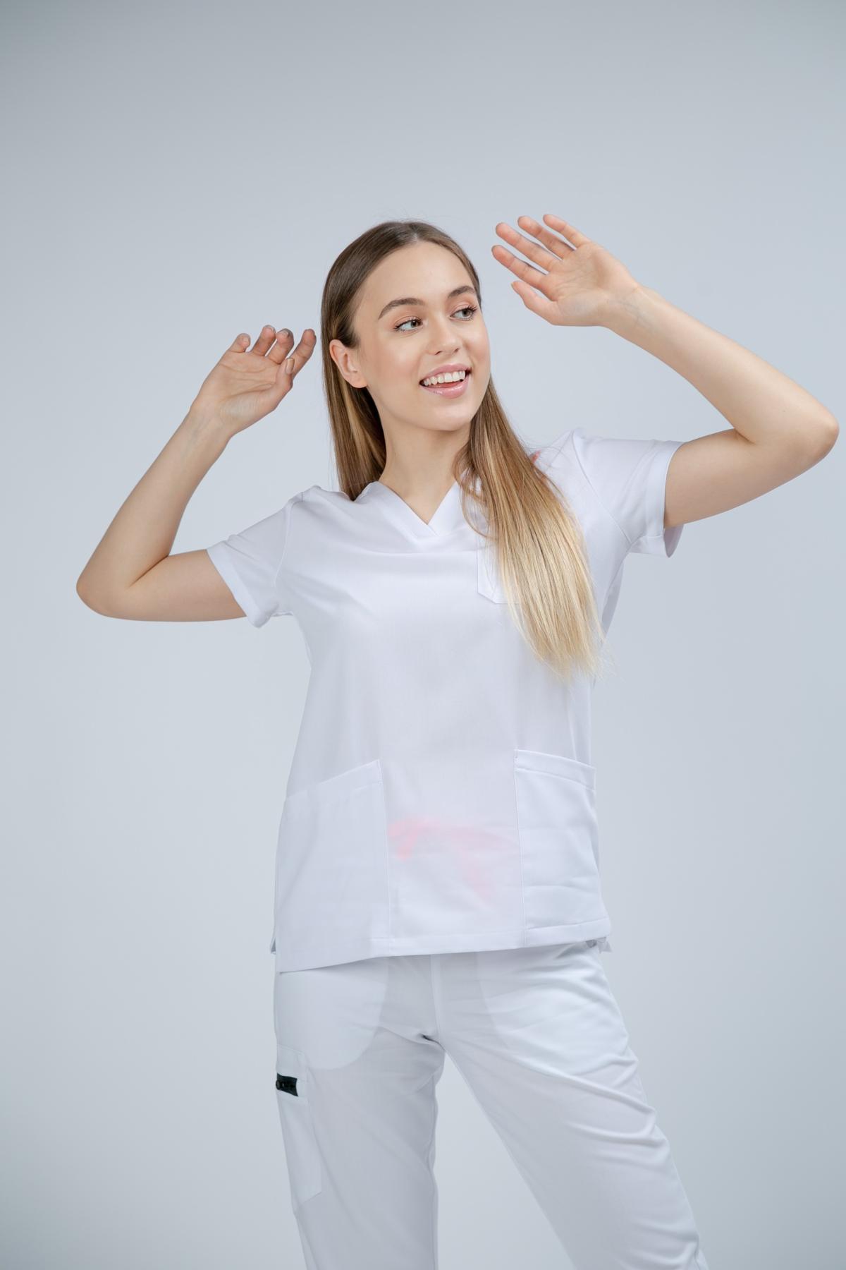 Отличный выбор для тех, кто любит белый цвет: удачная посадка на все типы фигур, красивые и аккуратные детали, а так же легкая в уходе ткань.