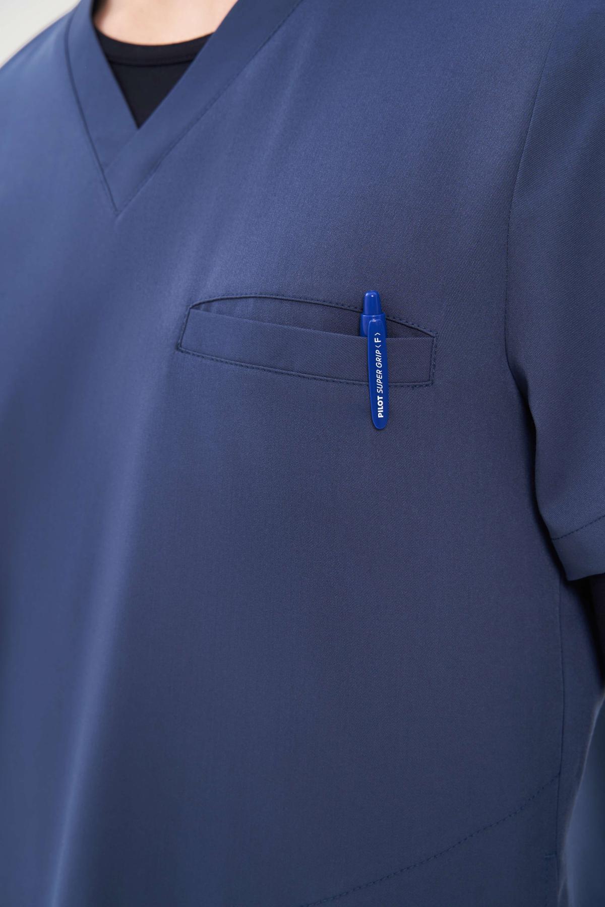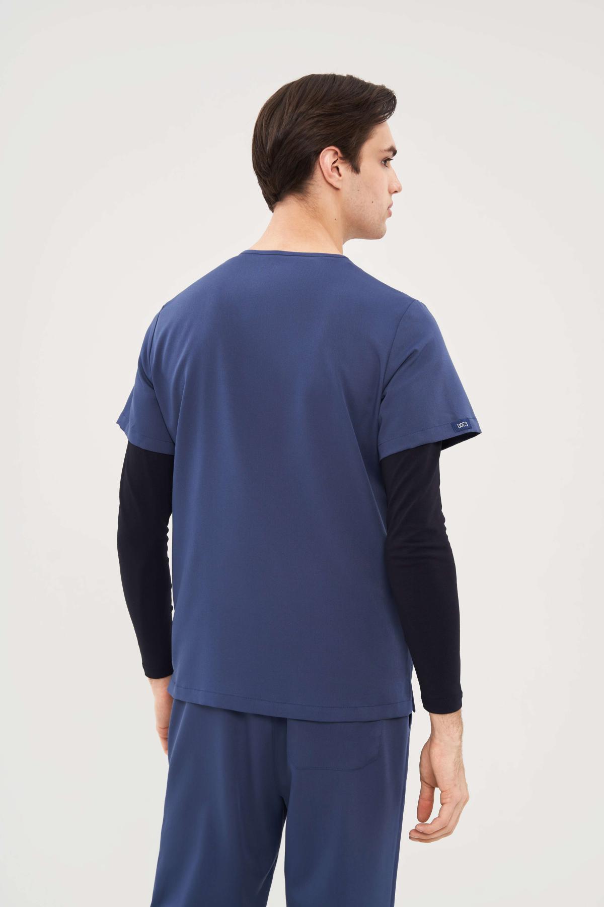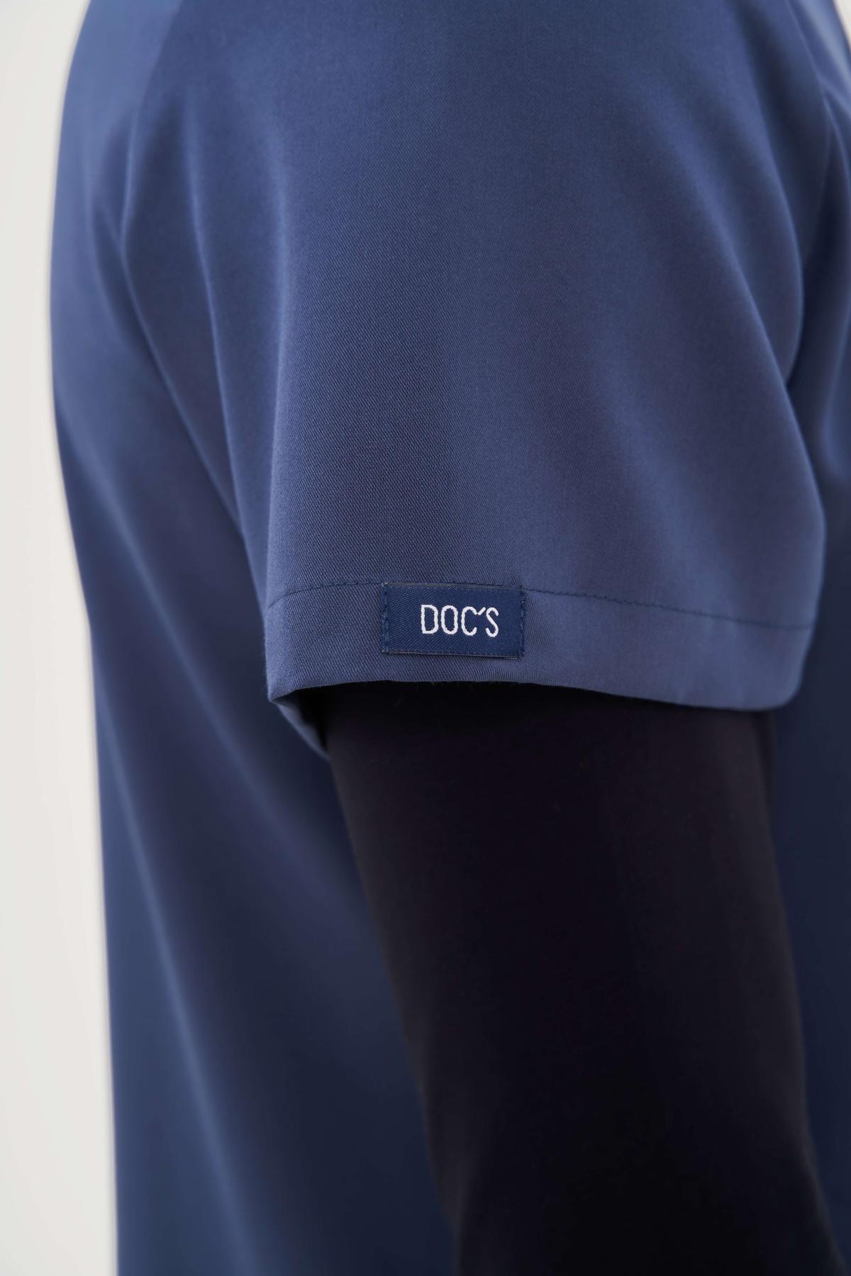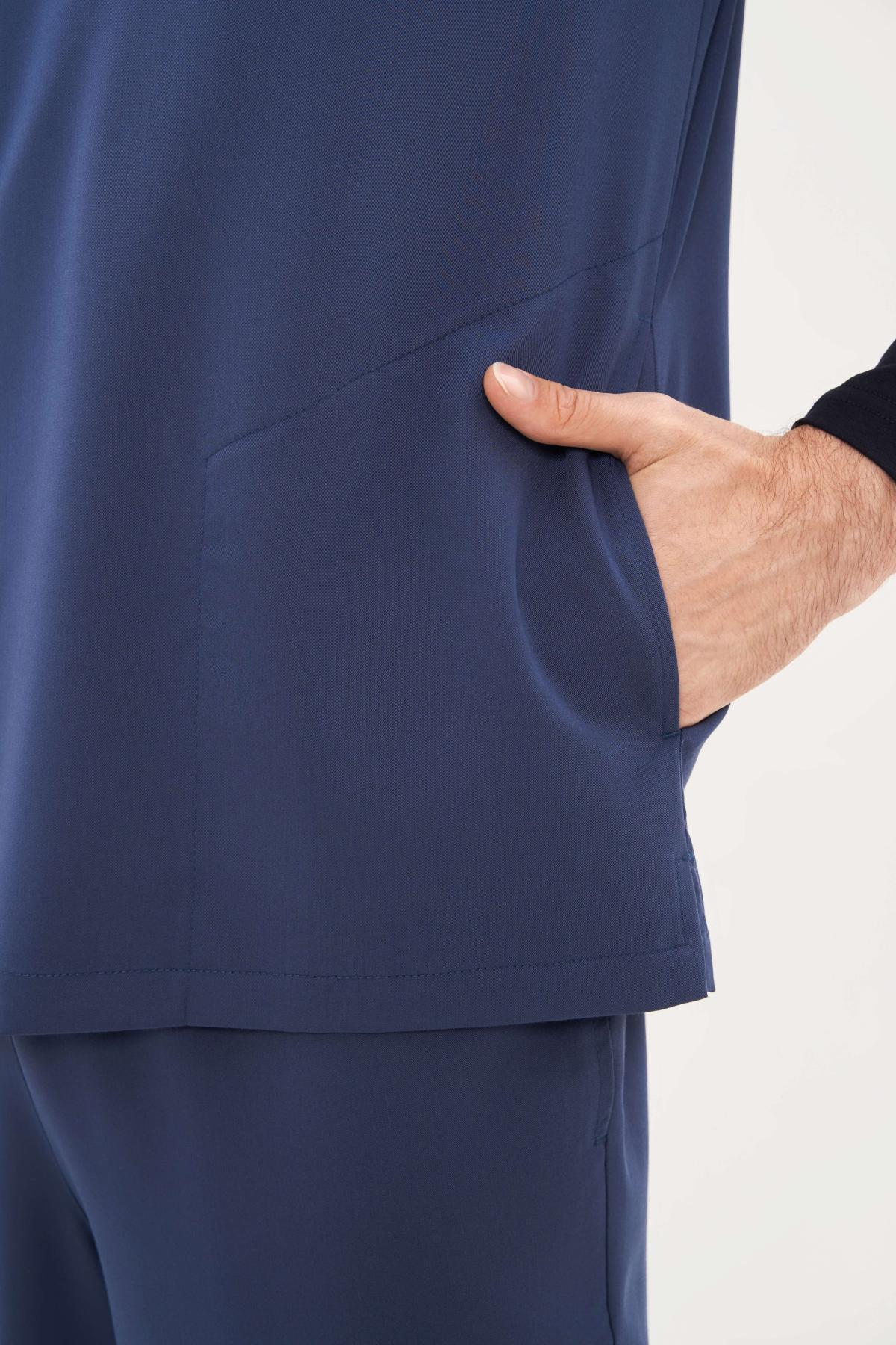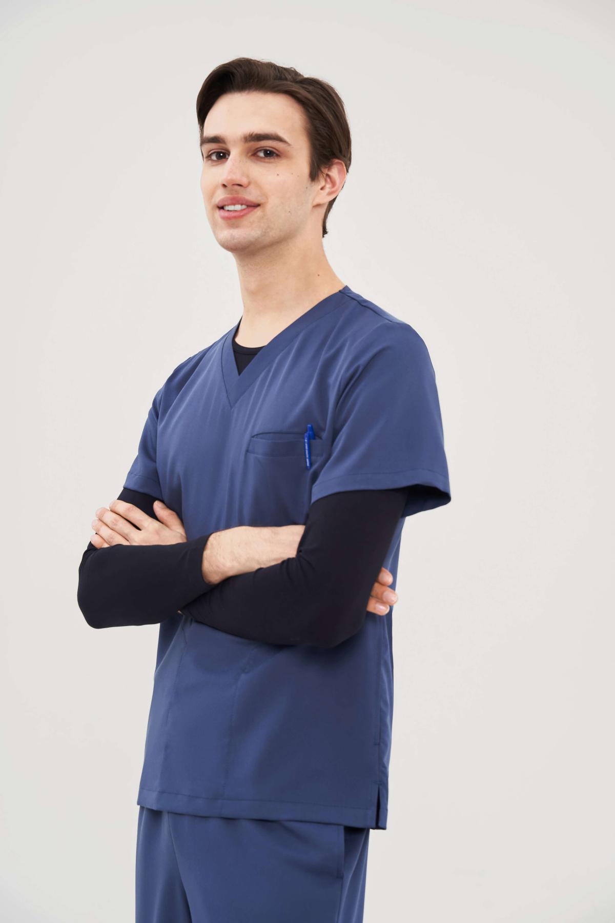 Классическая мужская медицинская рубашка с закругленным V-вырезом, двумя боковыми карманами и карманом - клапаном на груди в синем варианте. Ткань легкая, очень приятная на ощупь, дышит, мало мнется (её можно не гладить, если расправить после стирки), от неё отлично отстирываются пятна (в том числе, кровь) и после стирки ткань быстро сохнет, не садится и не деформируется в процессе использования.