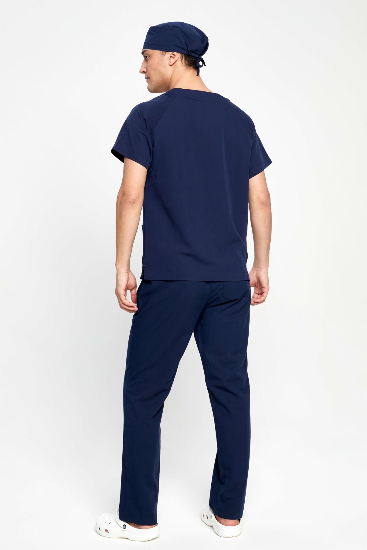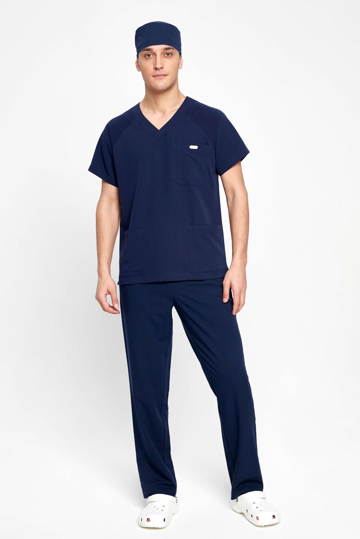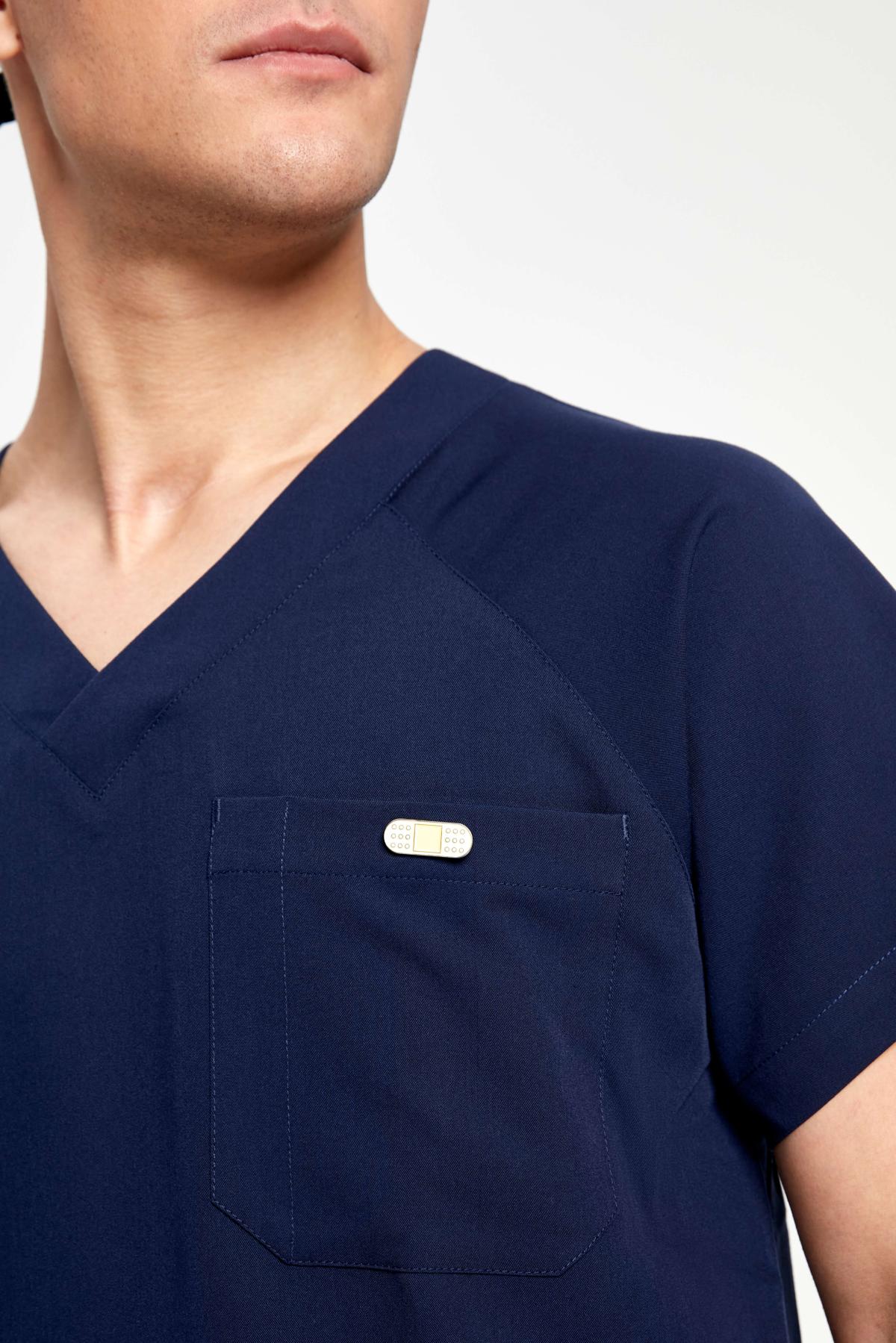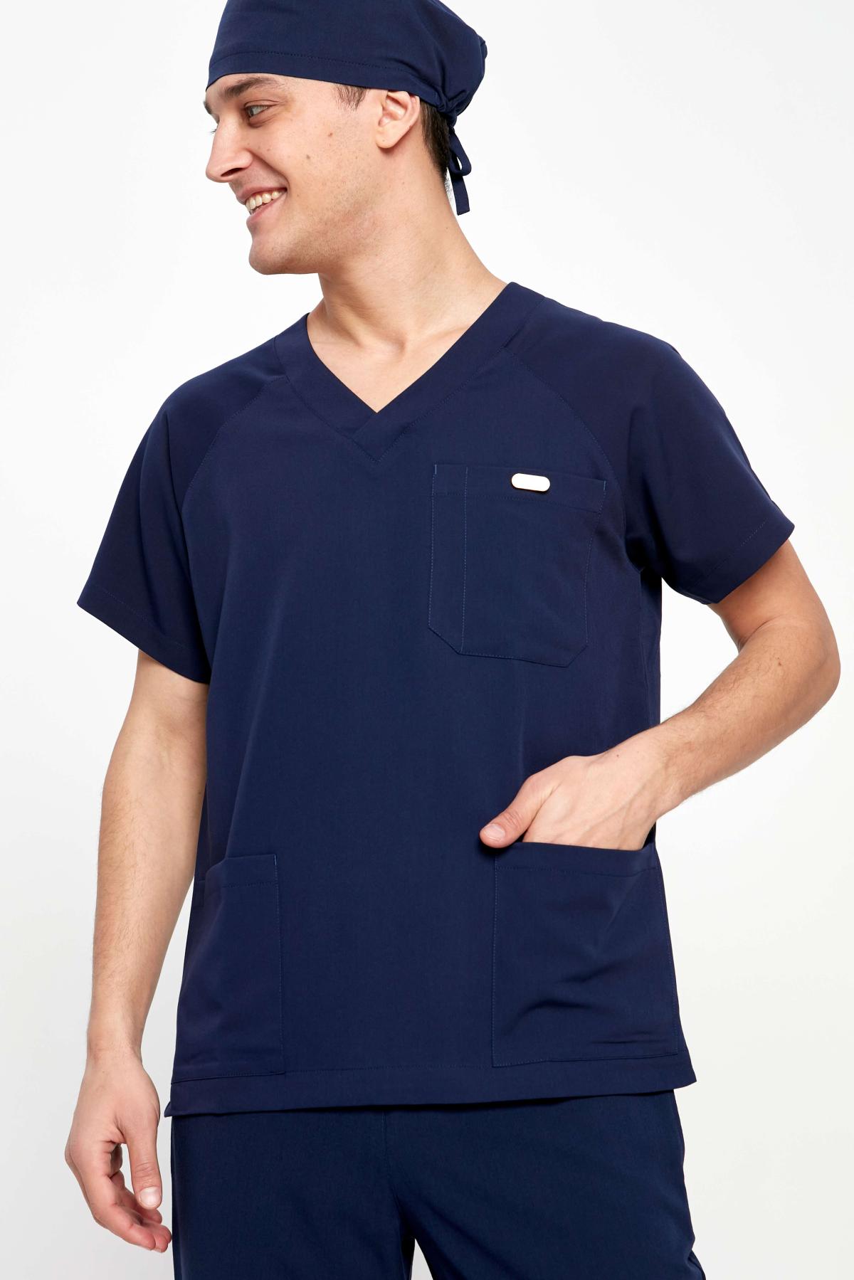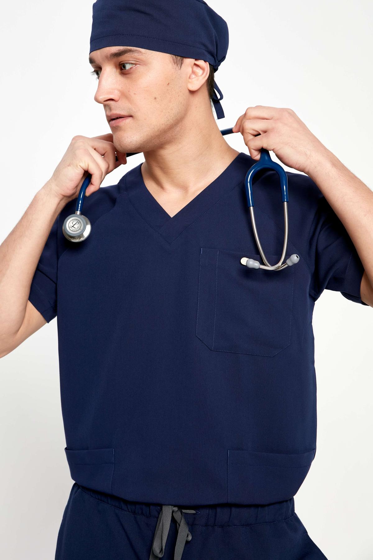 Наша базовая мужская медицинская рубашка в спортивном стиле с закругленным V-воротом и тремя карманами (2 боковых и 1 на груди). В костюмах DOC'S всегда соединяется стиль, функция и качество. Сшита из поливискозы (полиэстер+вискоза+спандекс), очень функциональной медицинской ткани - мягкой, дышащей, легко отстирывающейся и быстро сохнущей. Самое любимое свойство этой ткани - её можно не гладить, если аккуратно расправить после стирки. Вы будете выглядеть отлично, даже если в рубашке поспать на дежурстве. Садится размер-в-размер. Есть запас на свободу движений, так нам важно, чтобы все профессиональные движения были комфортны. Мы хотим, что бы наши медицинские костюмы были мягкими и удобными как пижама, которую просто не замечаешь, пока не посмотришь в зеркало. Нет, конечно вы не будете чувствовать себя голым, тем более, что мы используем ткань средней плотности, она не просвечивает и тактильно очень приятна. Обычные места отрыва (карманы, боковые швы) закреплены специальными швами и закрепками. Качество пошива - превосходное. Классический темно-синий цвет идет всем и отлично подходит для сочетания с другими цветами.