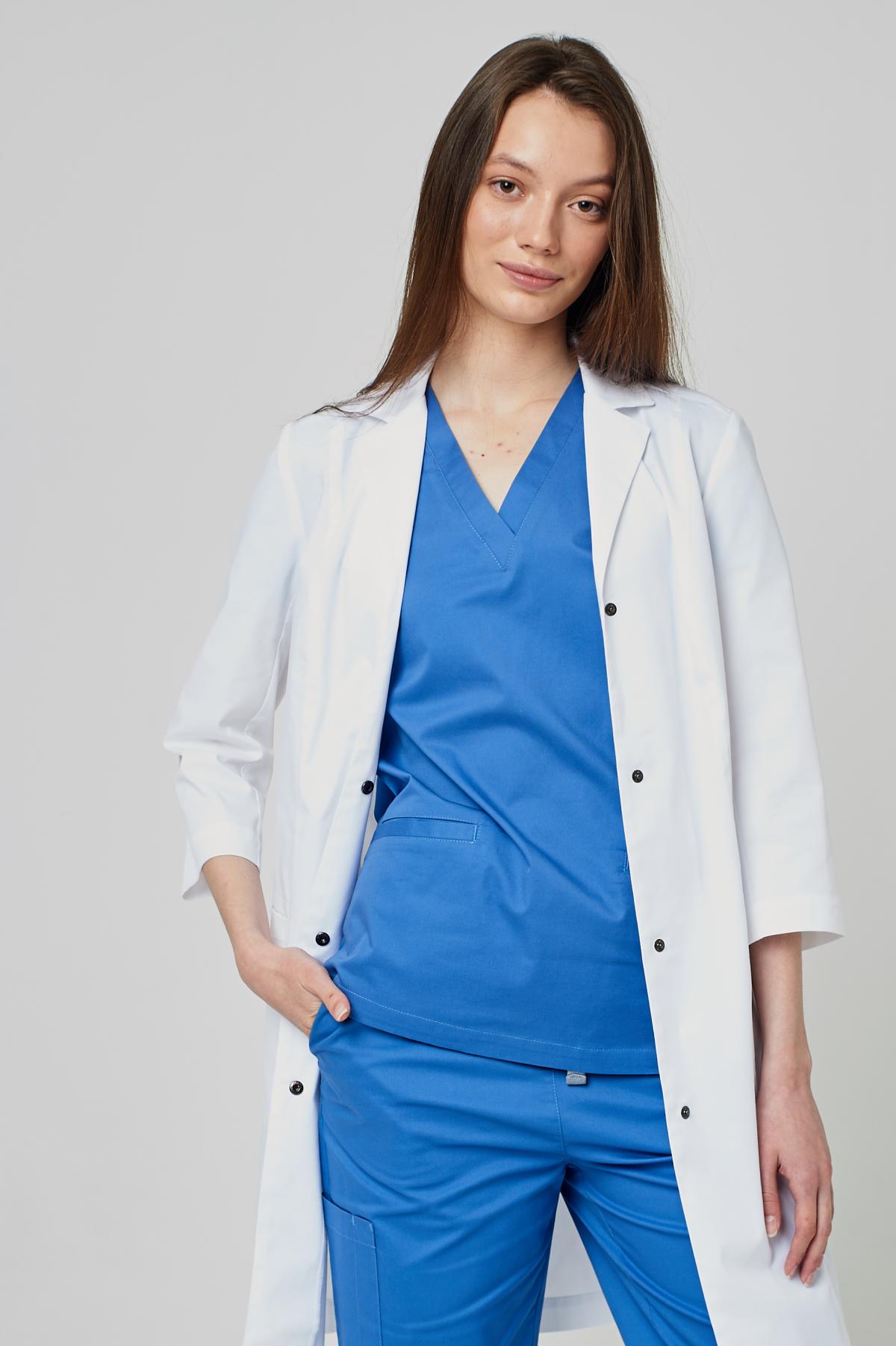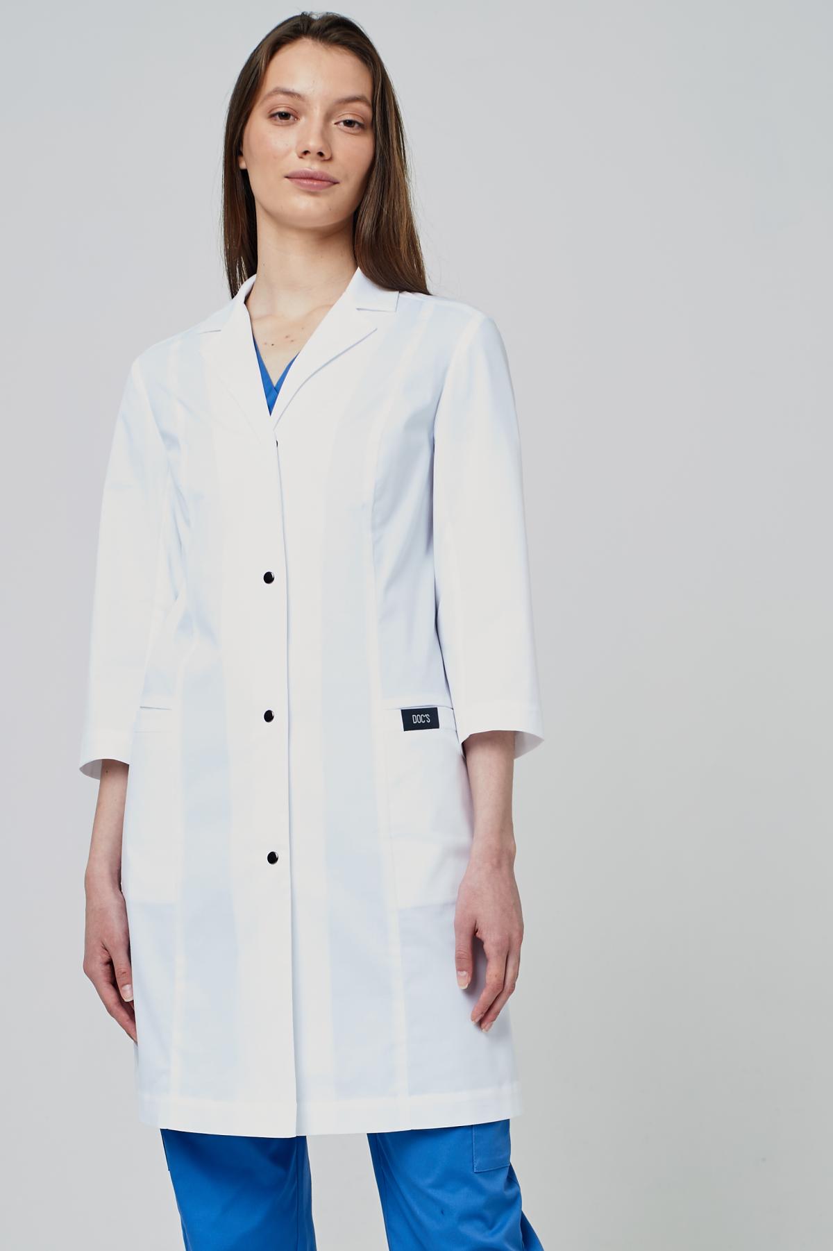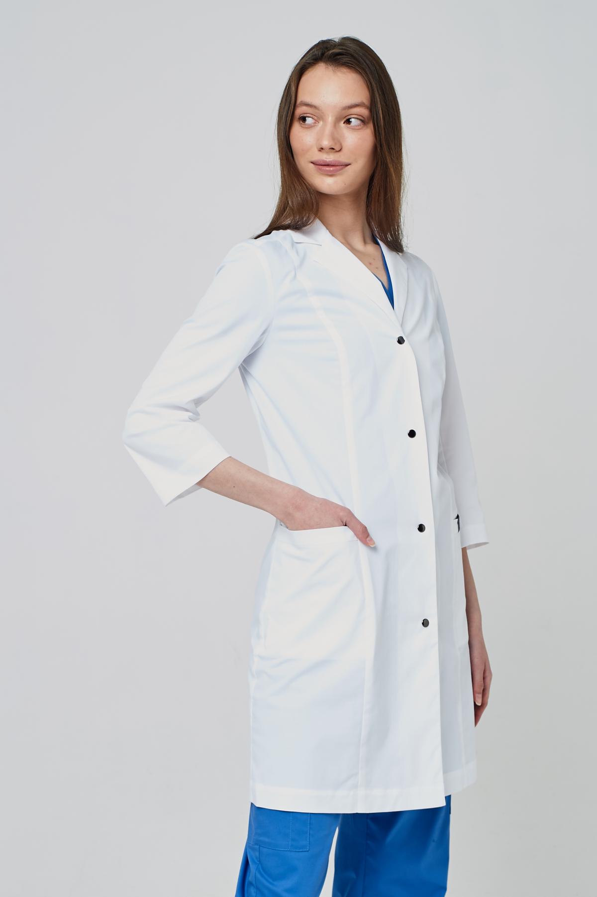 Приталенный халат с английским воротником и рукавами 3/4, на кнопках, из плотной хлопковой ткани. В нем есть все, чтобы было удобно. За что мы любим рукава 3/4? Во-первых, это красиво, во-вторых, удобно мыть руки, а в-третьих, чем короче рукав, тем меньше риск распространения внутрибольничной инфекции. Мы всегда заботимся о комфорте, функциональности и качестве изделий. Клиенты любят наши халаты за стиль, минимализм, удобство и надёжность. Нам важно, чтобы вы всегда чувствовали себя классно и были уверены в одежде 24/7.